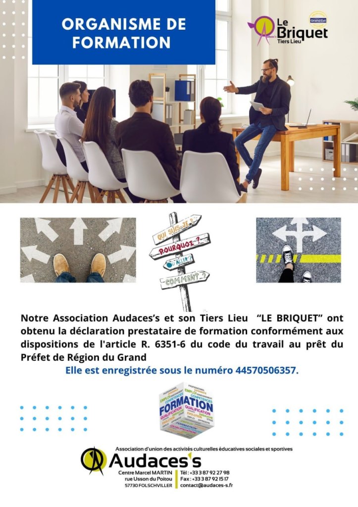Nous avons le plaisir de vous annoncer que l’Association Audaces’s et son Tiers-Lieu “Le Briquet” viennent d’obtenir la déclaration de prestataire de formation, conformément aux dispositions de l’article R. 6351-6 du Code du travail, auprès du Préfet de Région du Grand Est.